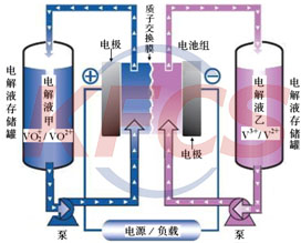 全钒液流电池,是一种以金属钒离子为活性物质的液态氧化还原可再生电池。全钒液流电池是以+4、+5 价态的钒离子溶液作为正极的活性物质,以+2、 +3 价态的钒离子溶液作为负极的活性物质,分别储存在各自的电解液储罐中。 在对电池进行充、放电时,正负极电解液在离子交换膜两侧进行氧化还原反应。 同时,通过电堆外泵的作用,储液罐中的电解液不断送入正极室和负极室内,以 维持离子的浓度,实现对电池的充放电。